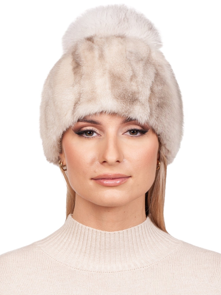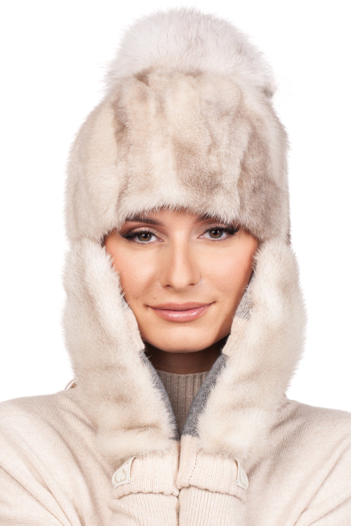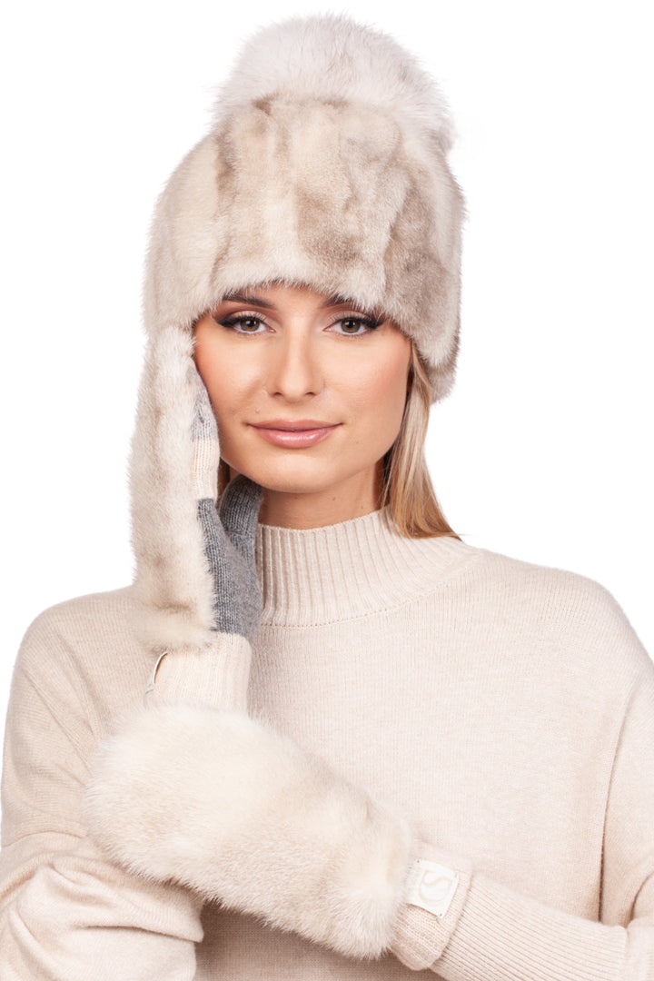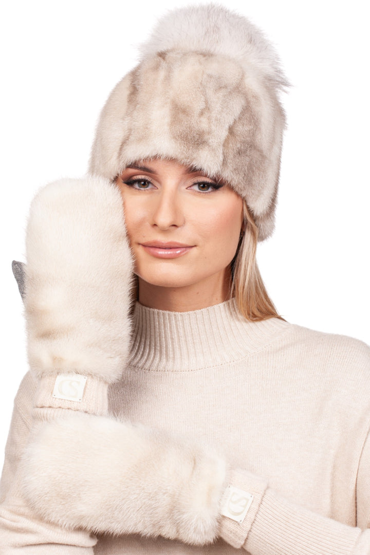 Smėlio spalvos audinės kailio beanie su derančiomis atverčiamomis pirštinėmis