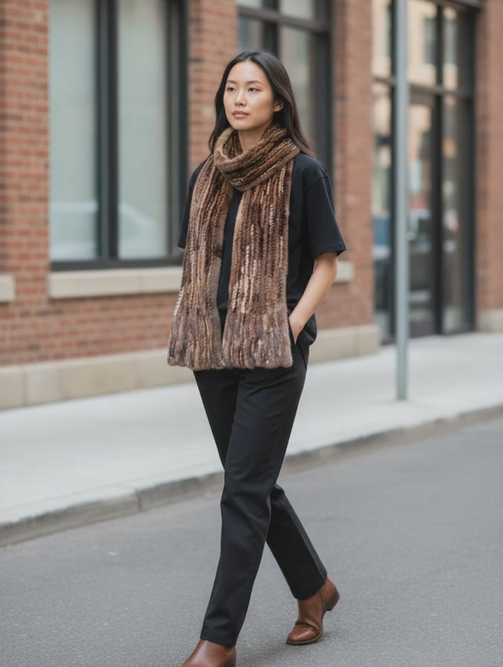 Wrap yourself in timeless elegance with the FurbySD Brown Mink Fur Scarf — a statement of luxury, craftsmanship, and warmth. Handcrafted from genuine knitted mink fur, this exquisite 180 cm scarf combines softness and versatility with a naturally radiant sheen that only real mink can offer. Whether you wear it as a classic long fur scarf, draped over your shoulders, or twisted into a snood, this piece elevates any outfit — from winter coats to evening dresses. The double-sided design ensures plush texture and warmth from every angle, while its lightweight feel makes it ideal for both outdoor and indoor elegance. Every FurbySD scarf is ethically sourced and handmade in Lithuania, ensuring superior European quality and lasting beauty.